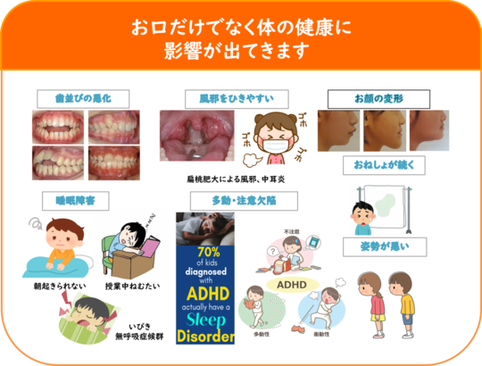 近年、食事が柔らくなってきていること、アレルギーなどの鼻疾患、人類進化に伴う顎骨の縮小によって、顎の成長とお口の機能が低下しています。お口の機能は、”食べる”、”呼吸する”、”話す”といった、あたり前の機能ですが上手に養われず、「口腔機能発達不全症」を呈している子がたくさんいます。そして、この口腔機能低下症はお口だけの問題ではなく、からだ全体の健康に関係してきます。