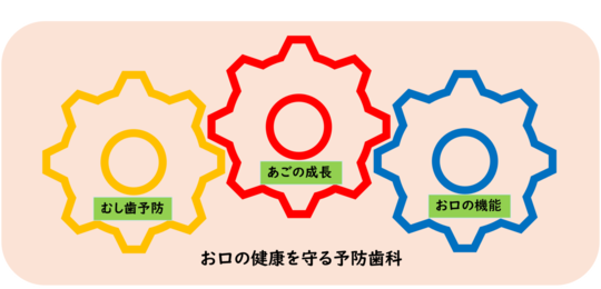 子供に必要な予防歯科は「虫歯予防」・「あごの成長」・「お口の機能獲得」が必要です。それぞれの要素がしっかり整わなければ、お口から体の健康まで守ることができません。小児期に予防歯科をとおして、自らの健康を守る知識を身につけることが、生涯をとして健康の意識を高めることにつながると考えています。